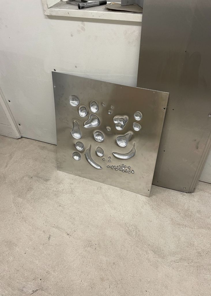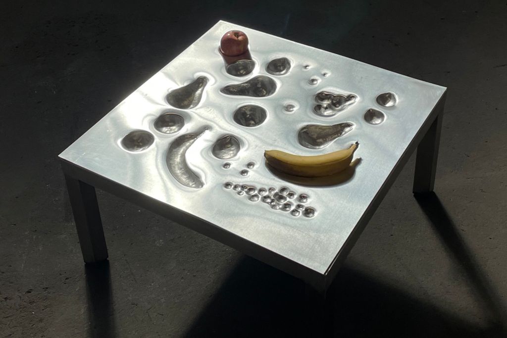 Much more than a simple table, this piece redefines the way we perceive and categorize objects. by questioning the traditional function of this furniture, Lisa Cipriano challenges established norms and frees our thinking from its usual patterns. three fruit forms gently merge with the aluminum surface, seamlessly blending into the structure of the furniture piece — becoming one.